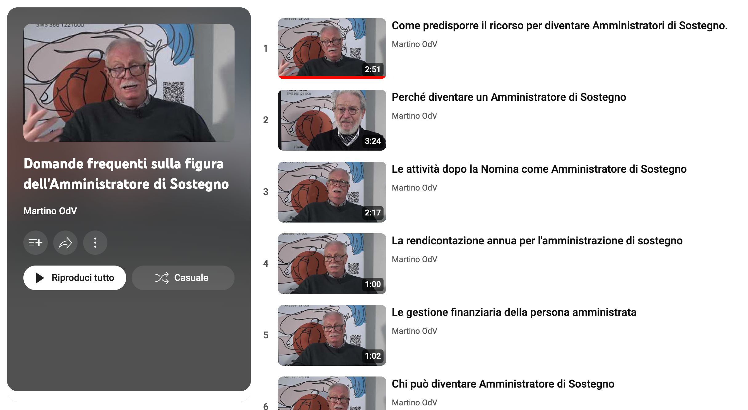 Sono finalmente disponibili nel nostro canale youtube le interviste in merito alle domande più frequenti sulla figura dell’Amministratore di Sostegno. Oltre 10 le tematiche su cui i volontari dell’Associazione Martino hanno risposto in breve. Sono 3 invece gli interventi del notaio Paludet a corollario per gli aspetti più prettamente tecnici in materia.
